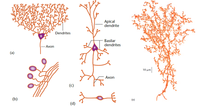 a) Purkinje cell (only found in cerebellum), b) sensory neurons from skin to spinal cord, c) pyramidal cell of motor area of the cerebral cortex, d) bipolar cell of retina of the eye, e) Kenyon cell from a honeybee (p. 22)