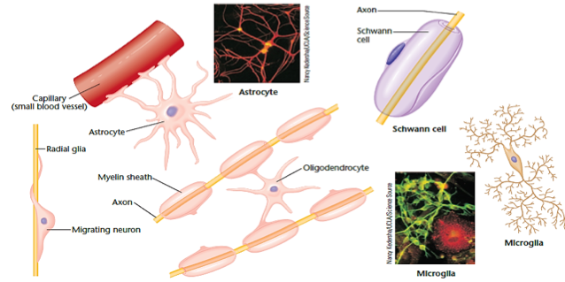 Glia: several types and serve different functions: astrocytes, microglia, oligodendrocytes, Schwann cells, and radial glia