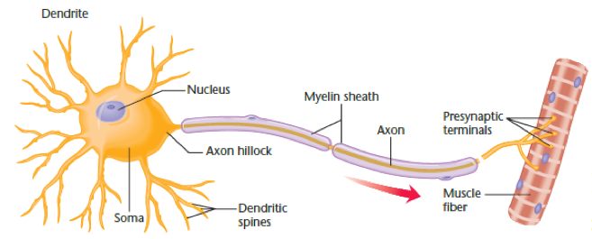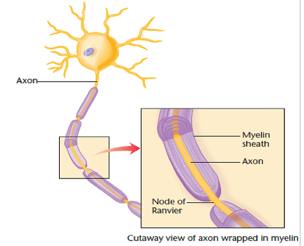 Axon:Thin fiber of a neuron responsible for transmitting nerve impulses toward other neurons, organs, or muscles. May have a myelin sheath, an insulating material that contains interruptions in the sheath known as nodes of Ranvier.