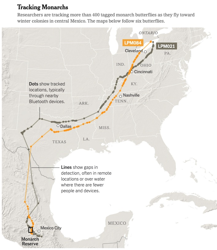 The following LINK gives access to the New York Times article (November 18, 2025): We can now track individual monarch butterflies. It's a revelation. Notice how one, LPM021, passed through SW Arkansas. Other butterflies are shown in the article.