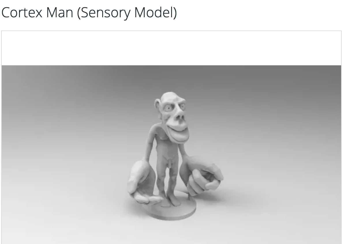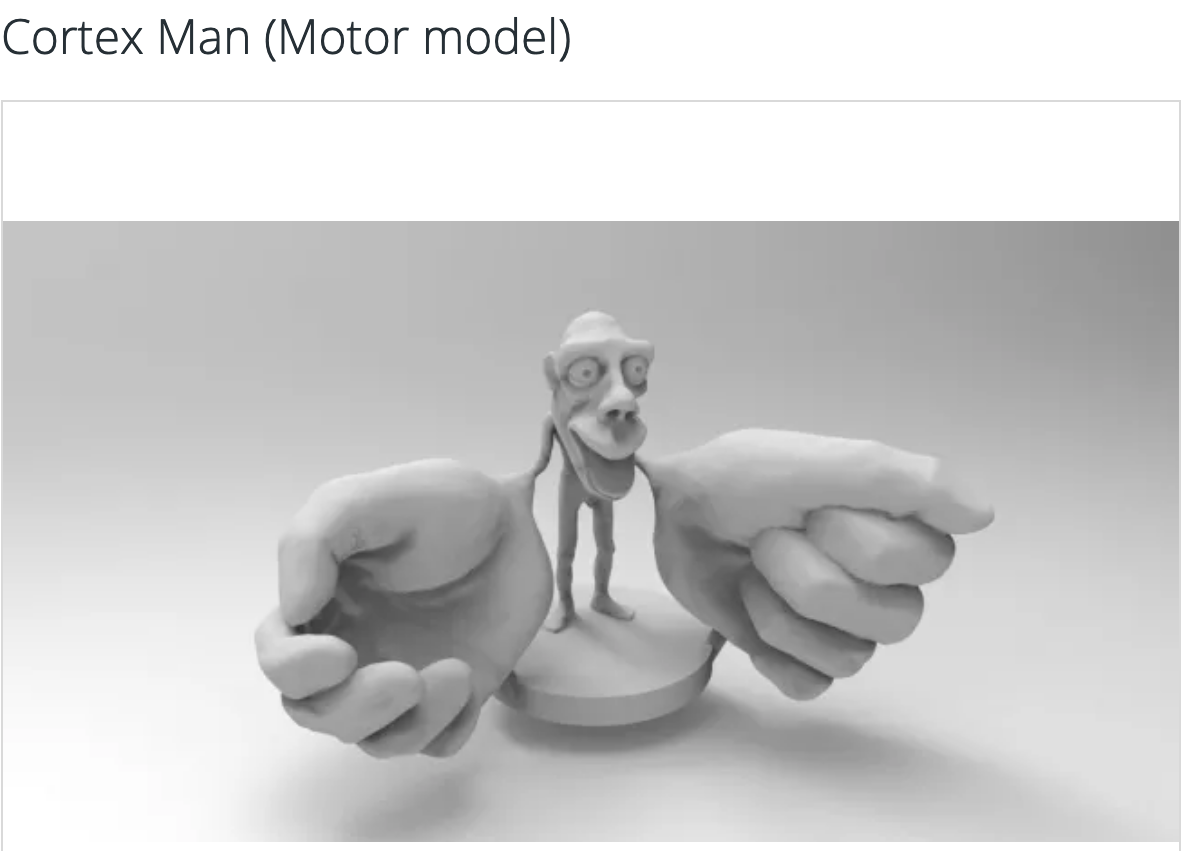 3-D motor homunculus (shows how some parts of the body are under more precise control/larger = more control)