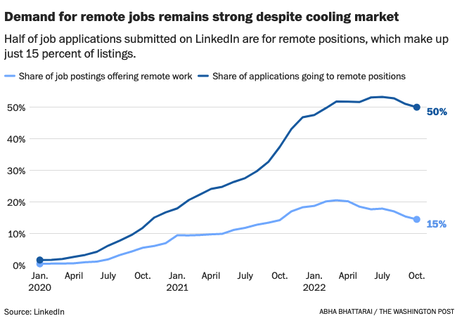 - "Although there are nearly two job openings for each applicant when it comes to on-site work, the opposite is true for remote jobs: There are two active applicants for each available work-from-home job on LinkedIn."
