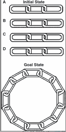 - “You are given four separate pieces of chain that are each three links in length. It costs 2¢ to open a link and 3¢ to close a link. All links are closed at the beginning of the problem. Your goal is to join all 12 links of chain into a single circle at a cost of no more than 15¢.”