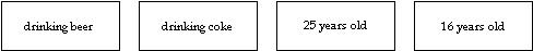 The cards below have information about four people sitting at a table in your bar. Each card represents one person. One side of a card tells what a person is drinking and the other side tells that person's age.